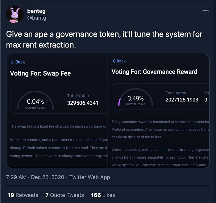Chris Burniske,Lane Rettig,Rhys Lindmarkamong many others. I had spent late 2017 and early 2018, wrapping up a paper on the mathematical frameworkI use for designing mechanisms in dynamical systems, and working withMarkus Buhatem KochandFernando Martinelli, applying that framework to complete the proofs underpinning theBalancer Protocol. Notably, the Balancer protocol calls for subjective parameter choices in the form of tokens supported, and weights of pools. It was already clear to many active researchers that governance of parameters was not a hypothetical problem, but one which would eventually come to dominate the political landscape of blockchain-based ecosystems.