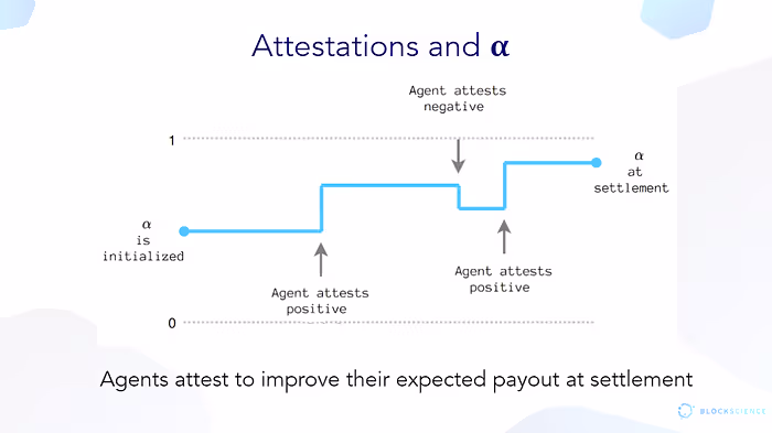 The diagram below demonstrates how the alpha coefficient is updated through agent attestations in the prediction mechanism: