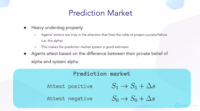 The prediction market avoids the Keynesian Beauty Contest problem (aka “voting with the crowd”) through the ‘Heavy Underdog’ property. This is the same reason you might bet on a severely outmatched team in the playoffs if you think they are going to win — because the payout is worth it to vote accurately according to your belief, rather than engage in tactical voting. With a risk-adjusted bonding curve, estimates of project success are updated with each transaction — making these tools essentially estimators of collective sentiment, a powerful new tool in the Token Engineering toolkit.