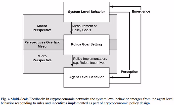 “Emergence closes the feedback loop of the macro, meso and micro level activities […] policy makers measure phenomena on a macro level, decide over new policies on a meso level, and implement these policies impacting agent behavior on a micro level, which in turn result in systemic effects that can only be measured on a macro level.” — Voshmgir & Zargham
