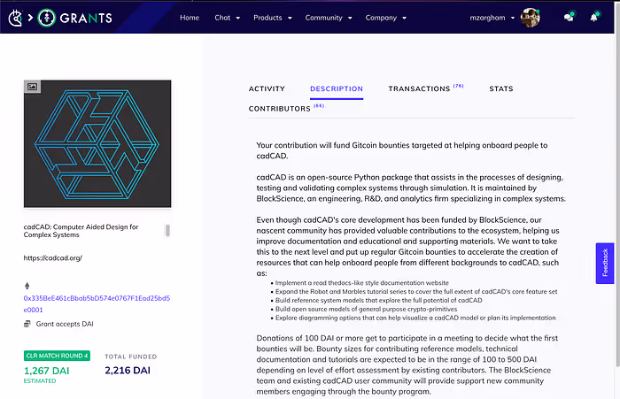 - The cadCAD Gitcoin grant raised 2,216 DAI from 66 unique contributors, of which 1,267 DAI came from CLR matching round 4.