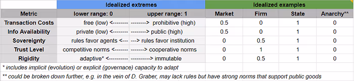 - Sovereignty (ranging from prioritizing agents to prioritizing institutions): refers to whether rules of the institution favors individual priorities over group outcomes. It refers to the power balance between agent and organization (which could be a company, nation state, or market). At one end of this spectrum, we see system rules permitting maximal freedom to the individual, where any repercussions of actions taken are normative. At the other end of the spectrum we find system rules providing maximal control to the institution, where the organization can demand any action of an individual and enforce its fulfillment.