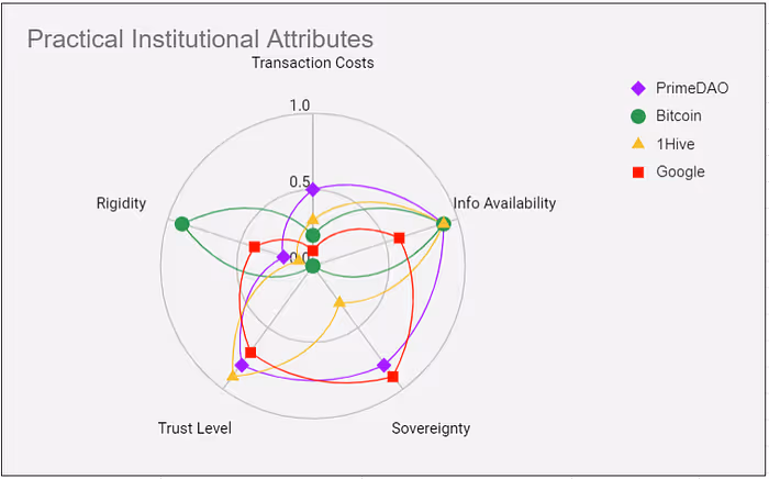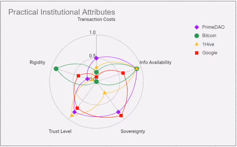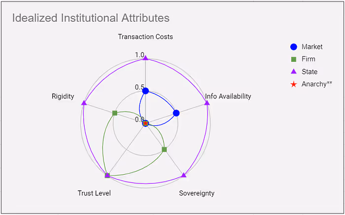 Below we have begun to analyze these attributes in the case of ‘idealized institutions’ since they tend to take extreme values in these attributes. One nice thing about quantifying these concepts as spectra is that we can plot them on a radar chart in order to reason about the design space of institutions in terms of these attributes. For example: