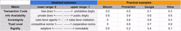 Once we have further hardened our definitions and refined our interpretations of those metrics via the idealized institutions — that do not exist as such in the real world — we will build out a list of real world examples which will include some well known DAOs, but could also include states and corporations. As a teaser into this process, we will explore our conceptual framework in one further practical exercise, loosely examining some DAOs and corporations relevant to the audience. These numbers reflect a hypothesis based on approximation for further research, they are not the result of a finalized scientific research process: