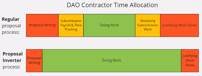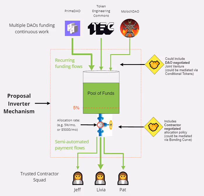 To mitigate these issues, we suggest the Proposal Inverter payment mechanism. This mechanism provides “decentralized HR” functionality for ongoing cross-DAO initiatives, with semi-automated payment flows & pre-negotiated contracts. It allows a trusted group of contractors to be funded by multiple DAOs for continuous work, with funds allocated per context-appropriate policy. By re-introducing some of the administrative capacities typically handled by HR departments in firms, we reduce the overhead for contributors from having to manage these tasks for each DAO they collaborate with, freeing up large amounts of productive work capacity.