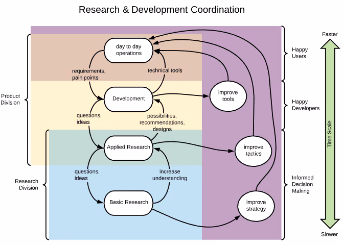 We produced the above diagram to explain the structure of complementary research & development initiatives, and the different layers (and timescales) of innovation that they lie on. Research processes necessarily require large amounts of work to go from theory to practical implementation, but this work lays critical foundations to later deployments. We must be careful not to fall prey to the free-rider problem within our own R&D cycles.