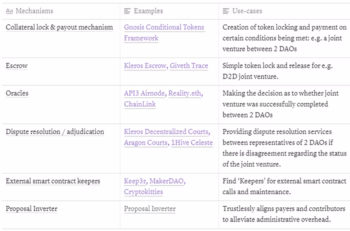 - Joint Ventures: In the analogue world a joint venture refers to a separate legal entity that is created by two or more institutions where the parties to the venture have some form of shared governance, ownership, shared risks & returns. This could be done for various reasons of entering new geographical markets, lines of business, mutual research, by sharing risks and resources with other existing institutions. However setting up such ventures comes with considerable administrative overheads and legal costs involved to ensure contract security. In the web3 space, with the growing ease of DAO tooling for deployments, joint ventures often end up with a whole new DAO-based organization for proper coordination. While this is acceptable in the right context, it can also create additional administrative overhead for collaborators who would be better suited to tools supporting a joint venture between DAOs, rather than having to create a new organization custom to that purpose. For this reason, the second assemblage we suggest in section 2.2 below for further discussion & possible deployment is the Conditional Tokens Framework.
