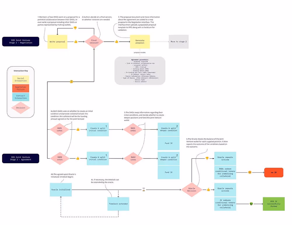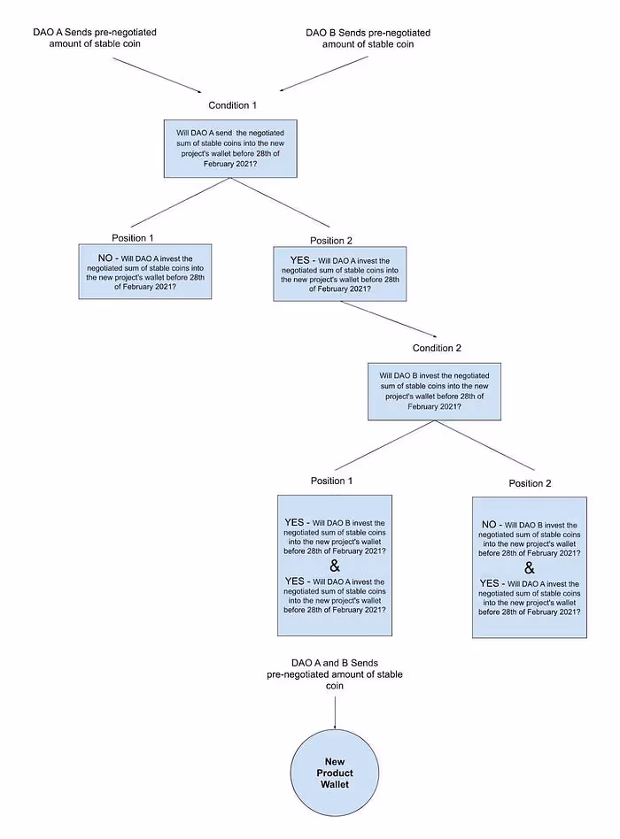 The key characteristic of the Conditional Tokens Framework (CTF) that is being utilized in this stage is the possibility of tokenizing all of the potential outcomes of a particular question, with the tokens representing the outcome that was reported to have occurred being redeemable for collateral later on; by creating deep binary conditions regarding whether two DAOs have co-funded a specified joint venture wallet, we are able to create a mechanism via which two DAOs can recover their side of the co-funding in case the other DAO does not follow through with its commitment. This is possible by transferring the Conditional Tokens representing the outcome of both DAOs funding the joint venture (in this instance, the ‘yes’ positions for each condition) to the allocated joint venture wallet, and keeping the other tokens (the ‘no’ positions). In the event that both DAOs do in fact co-fund the wallet, the tokens held by it can be redeemed for the underlying collateral used by both DAOs when creating the initial conditions. If not, these tokens are worthless, and the tokens held by each DAO representing all other outcomes can be redeemed for the underlying collateral.