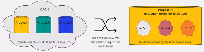 A future of increasing DAO2DAO interaction patterns will require more seamless collaboration on joint initiatives, particularly those with shared benefits like open source research or other public goods. It is to this end we consider the “Proposal Inverter” mechanism. The proposal inverter is a funding primitive that enables multiple groups or individuals to collaborate on common proposals, inverting the typical Proposal/DAO relationship to facilitate cross-DAO initiatives, such as co-funding shared research.