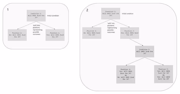 The agreement stage involves both DAOs voting on the proposal. If these votes pass, then both DAOs create an initial condition (a question regarding the funding of the joint venture) and supply collateral to back the positions (possible answers to this binary question in the form of ‘yes’ and ‘no’) via their treasury, which receives Conditional Tokens in return. They then subsequently create deeper conditions by ‘splitting’ one of their positions (e.g. ‘Will DAO 1 fund the JV? Yes’) by the other DAO’s condition, creating combinatorial positions (e.g. ‘Will DAO1 fund the JV? Yes’ & ‘Will DAO2 fund the JV? Yes’).
