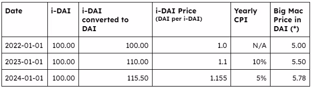 A simple example of a Flatcoin would be the fictional “i-DAI”: an Inflation Corrected DAI. The i-DAI would have its peg attached to a reference time, and its price would be adjusted in real-time in response to changes in inflation, such that the purchasing power for i-DAI holders is conserved. The table below demonstrates this stylized behavior. As we’re going to see over the course of this article, although i-DAI is a piece of fiction right now, it can become reality through the usage of a controller-based stablecoin (CBS), which already exists in production through examples like RAI.