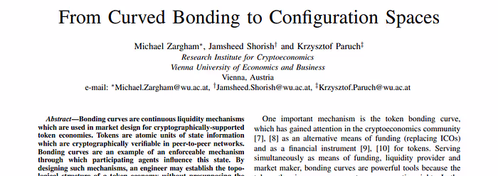 This article introduces the main sections & concepts from the paper “From Curved Bonding to Configuration Spaces” by Michael Zargham, Jamsheed Shorish, and Kris Paruch, published at the University of Vienna Institute for Cryptoeconomics. The paper builds on concepts established in Foundations of Cryptoeconomic Systems, and is expanded further in Economic Games as Estimators.