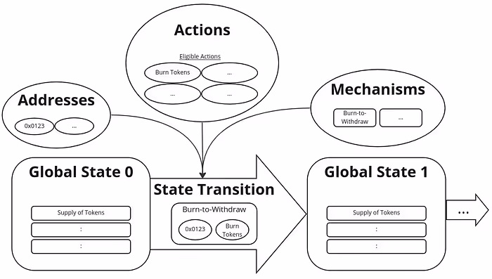 Furthermore, a State Transition occurs when a valid[1] combination of an agent address, action, and mechanism triggers a change in one of the state variables.