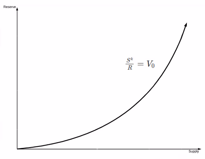 Once the bonding curve is initialized, we can generalize this same formula to all values of S and R (not only the initial values) and end up with the bonding curve conservation function: