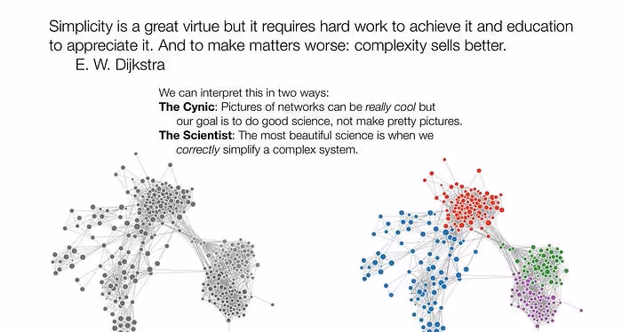 Figure 1: Slide from complex systems conference by Dan Larremore, Professor at the University of Colorado Boulder; Computer Science & BioFrontiers Institute. On the left, a ‘pretty picture’ of a network. On the right, that same network ‘simplified’ into subsystems for analysis and simulation.