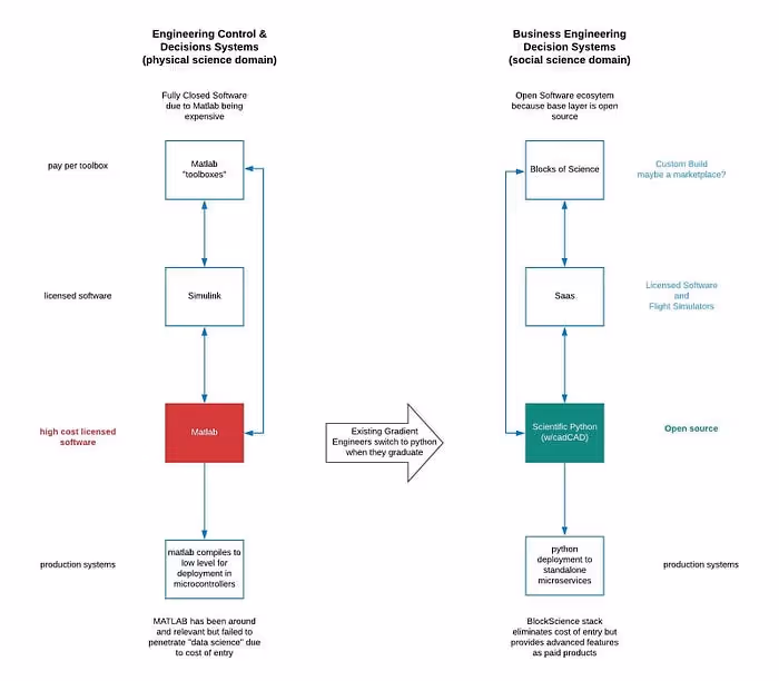 Figure 2: cadCAD as open-source and business-oriented equivalent to MATLAB, the closed-source scientific programming environment with specialized toolboxes for decision systems design, system identification, and automation under uncertainty.
