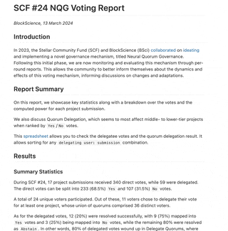 BlockScience has been enlisted for providing simulation-driven analysis for the SCF Implementation of Neural Quorum Governance, which has been ideated and specified by BlockScience engineers Danilo Bernardineli and Jakob Hackel with contributions from the Stellar Community for providing a modular and flexible form to attributing Voting Power.