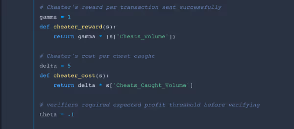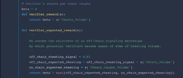 One can see that I set it up so that the rewards net out on average, funneling the cheater penalties to verifiers.
