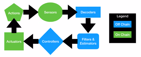 In the figure above, the off-chain components labeled in blue are local to a node or agent in the network and kept private from the rest of the network. Some simpler closed loop systems could be entirely implemented on chain, but computation limits make this infeasible as the default configuration.