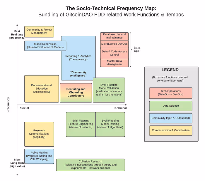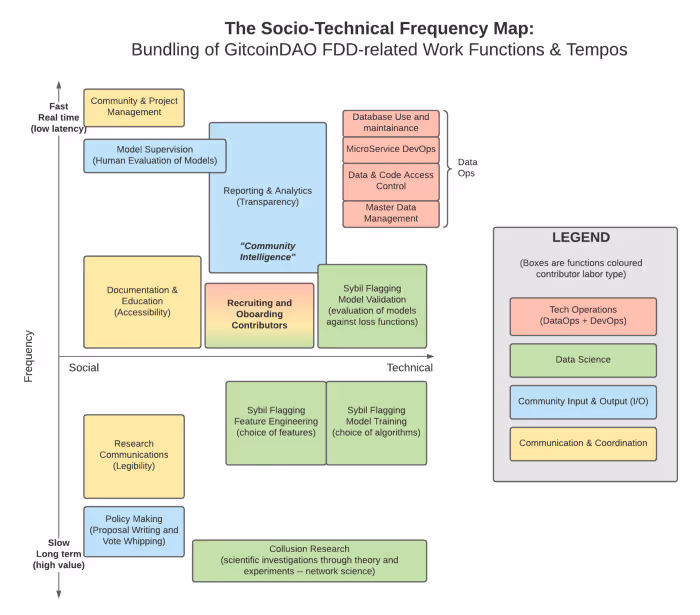 This article focuses on the different modes of work involved in the GitcoinDAO FDD working group, particularly in the inclusion of more skilled GitcoinDAO contributors in the progressive operation of the human-ML Anti-Sybil Operationalized Process. It will also introduce a new tool called the Socio-Technical Frequency map, used to understand the different modes and frequencies of work going into this hybrid human-machine learning process. Ultimately, we are exploring what it takes for a DAO to be successful in breaking down complex work and automated components into achievable tasks carried out by decentralized sub-groups of contributors.