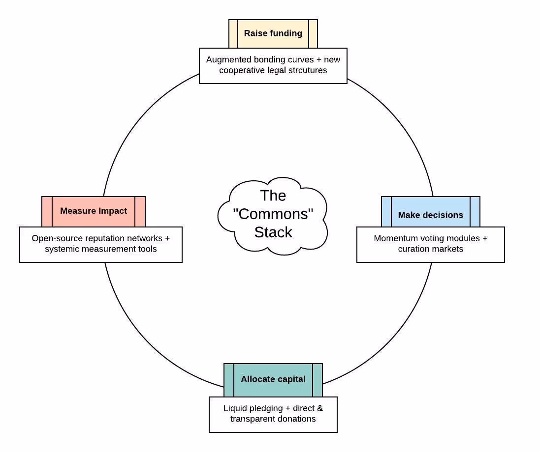 Commons Stack: reference architectures and reference implementations for open collaborative communities building and/or maintaining commons. Notable initiatives within the commons stack include ‘Conviction Voting’ and ‘Augmented Bonding Curves.’ More details to come. (Point of contact Griff Green at @Giveth)