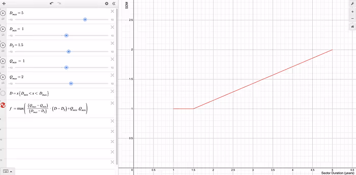 On which we have the following nomenclature: Qmax and Qmin are the Maximum and Minimum Quality Factor due to Sector Duration, Dmax, Ds, and Dmin are the Maximum, Transition, and Minimum Sector Duration, and D is the Committed Sector Duration.