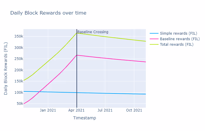 In the following chart, we can observe the cumulative rewards in Filecoin over time with a daily granularity and for both minting functions.