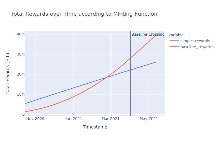 The usage of two minting mechanisms, one that is independent of the network’s capacity and another that continuously adapts to the current reality allows Filecoin to have incentives that are aligned for a diversity of scenarios, both good and bad. In good times, when the network is operating as intended, growth is rewarded with further growth as more minting opportunities are unlocked faster with Baseline Minting. By contrast, when unanticipated shocks hit the system, such as a sudden capacity constraint, Simple Minting provides dependable minting support that allows participants to ‘weather the storm’, countering and mitigating the effects of short-term volatility, and allowing the system to rebound smoothly and effectively as new storage is brought online.
