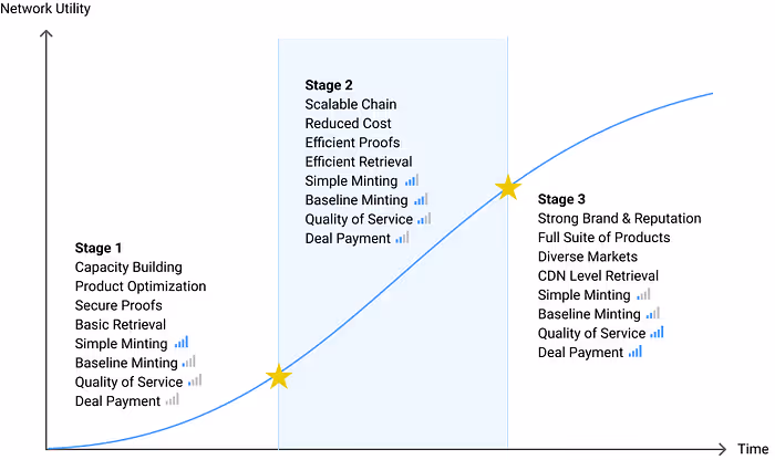 The final transition from Stage 2 to Stage 3 in Figure 2 above will require the involvement of all Filecoin participants, to allow the network to become ever more useful. In this stage, Filecoin becomes a diverse and useful network for goods and services, allowing the large community of participants to consolidate the network’s productivity and efficacy over a long-term perspective.