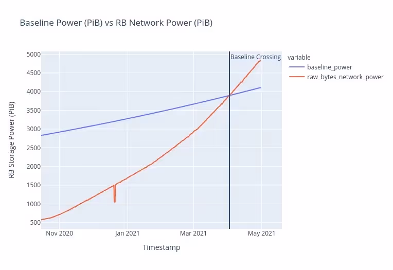 The Network Baseline for Filecoin has crossed the Baseline Target for the first time! This is an important milestone that marks a transition on the path of continued sustainability of the network. This happened at 05:00 UTC on 02 April 2021 — or 00:00 UTC on 21th December 2020 if we measure through the Network Effective Time, which is a key component of why baseline minting is important.